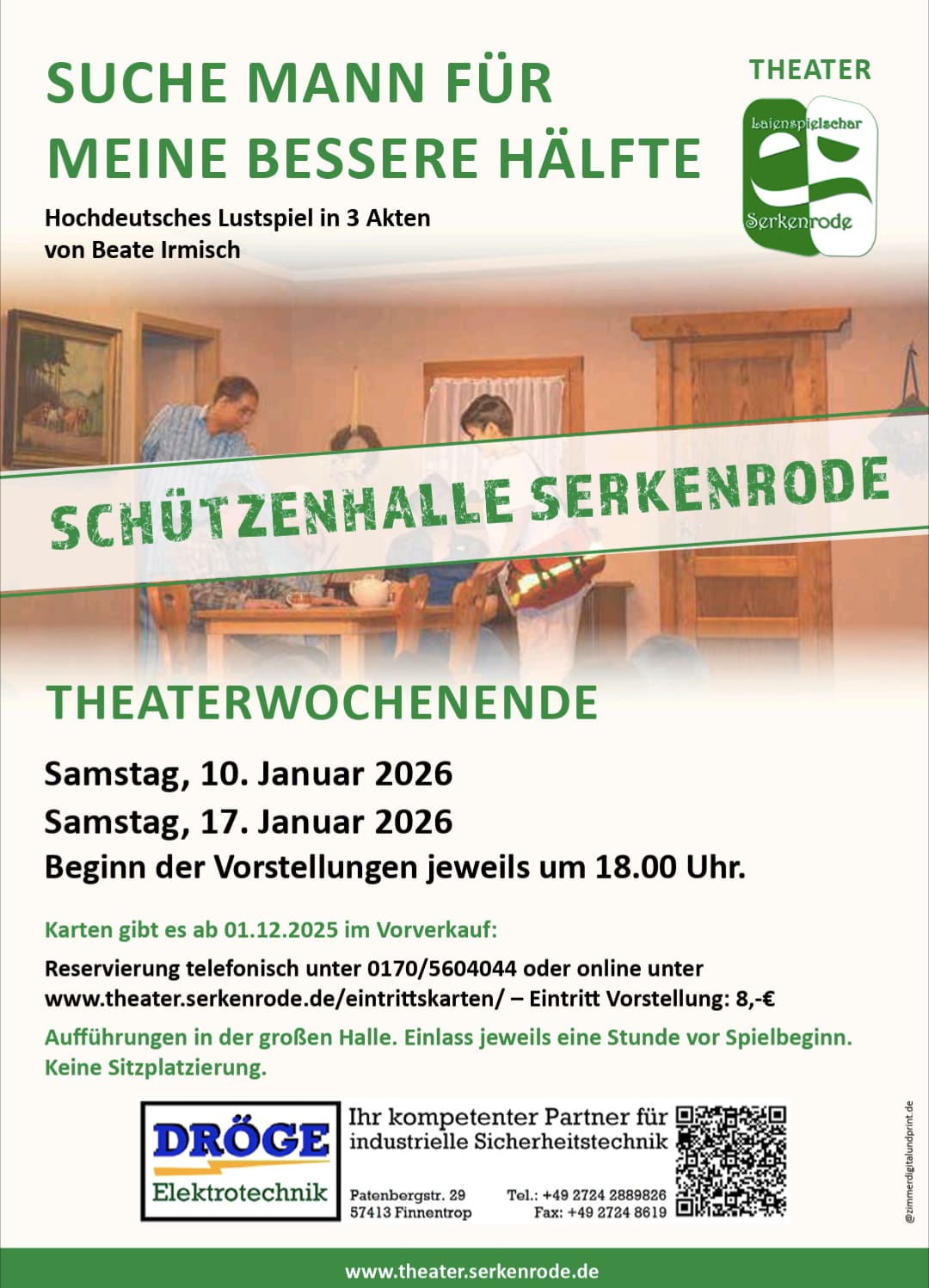 Die Theater-Vorstellungen zum neuen Stück „Suche Mann für meine bessere Hälfte“ – ein Lustspiel in 3 Akten von Beate Irmisch – sind an folgenden Terminen