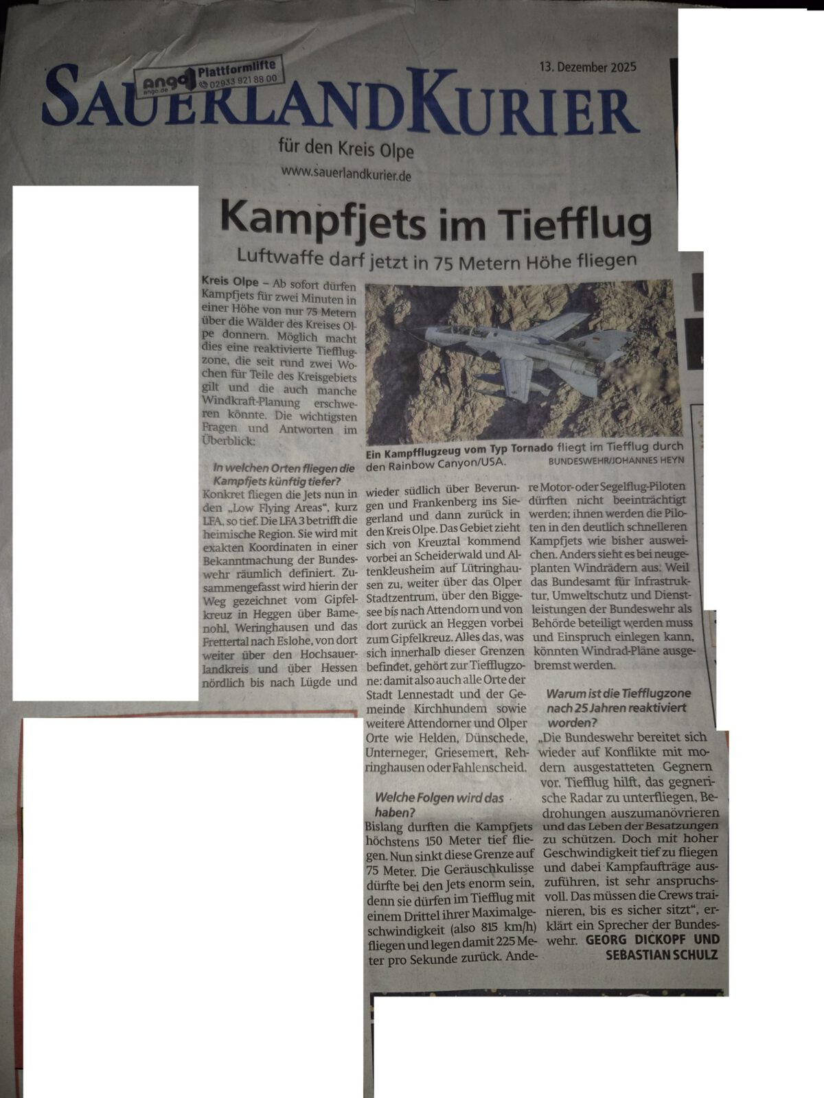 Der Sauerlandkurier vom 13.12.25 titelt mit der Schlagzeile „Kampfjets im Tiefflug“ „Luftwaffe darf jetzt in 75 Metern Höhe fliegen. „…. Anders sieht es bei neugeplanten Windrädern aus. Weil das Bundesamt für Infrastruktur, Umweltschutz und Dienstleistungen der Bundeswehr als Behörde beteiligt werden muss und Einspruch einlegen kann, könnten Windrad-Pläne ausgebremst werden.“